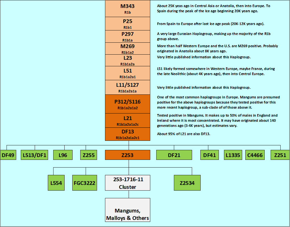 the Mangums belong) to the L21 and DF13 and Z253 major Haplogroups.