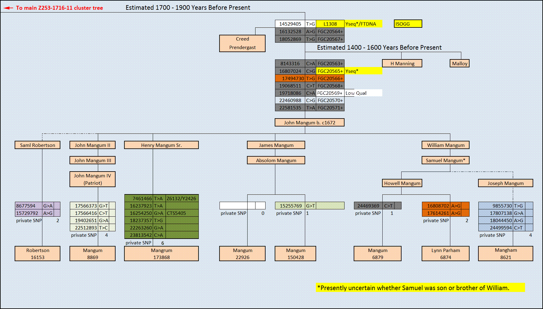 The Z253-1716-11 cluster mentioned here is a group of lineages below the Z253 Haplogroup that have a certain group of STR mutations in common. Remember, the STRs (Short Tandem Repeats) are the standard markers (12, 26, 37, 67, 111) we initially tested for at FTDNA. In other words, all of us in the cluster have several identical STR marker mutations from the Z253 modal. [STR marker 511=11 (mutated from 10), 557=17 (mutated from 16) and 449>=30 (mutated from 29). Also, marker 439 has often mutated from 12 to 13, and in the Mangum family there is a second mutation from 13 to 14. Although not official, we could consider the Mangum and a few others (Manning-Malloys-Creed-Prendergras at this writing) belonging to their own ‘Cluster’ designated Z253-1716-1308. For more information, see the Journal, Issue 64, page 60.]