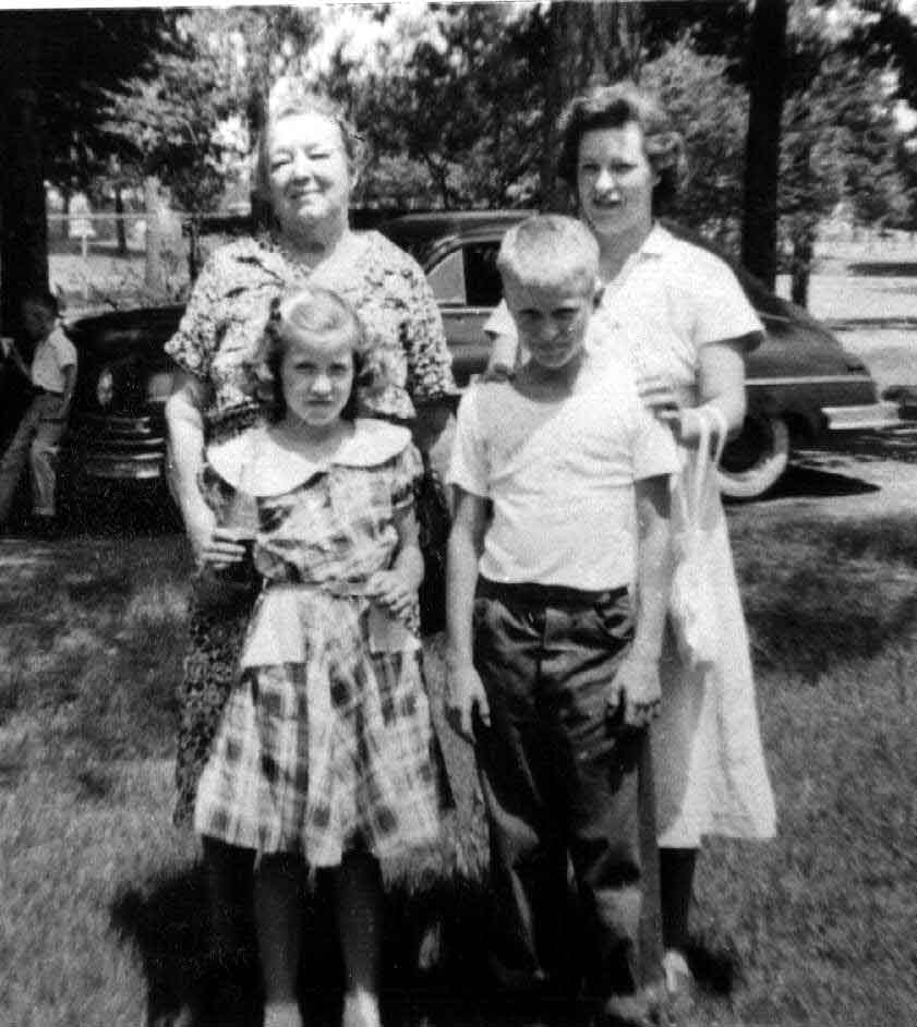 Lizzie Butler, Mildred Parham, Jaxie and Lynn Parham at a picnic in the park, Little Rock, Arkansas about 1949.