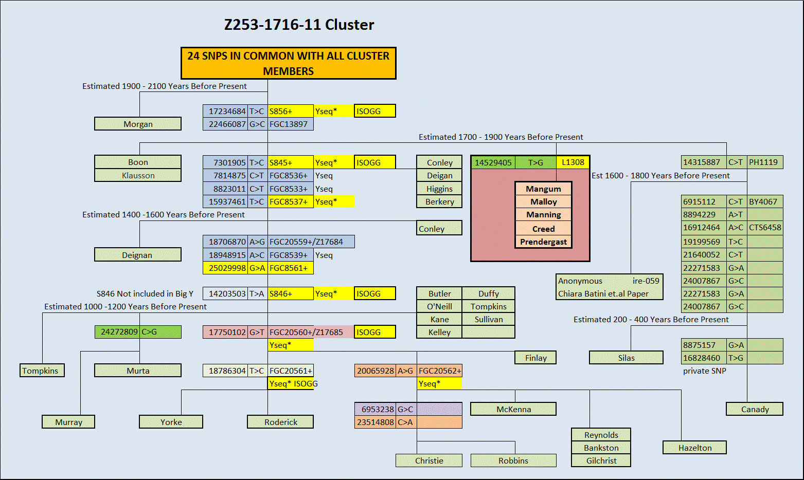 The Z253-1716-11 cluster mentioned here is a group of lineages below the Z253 Haplogroup that have a certain group of STR mutations in common. Remember, the STRs (Short Tandem Repeats) are the standard markers (12, 26, 37, 67, 111) we initially tested for at FTDNA. In other words, all of us in the cluster have several identical STR marker mutations from the Z253 modal. [STR marker 511=11 (mutated from 10), 557=17 (mutated from 16) and 449>=30 (mutated from 29). Also, marker 439 has often mutated from 12 to 13, and in the Mangum family there is a second mutation from 13 to 14. Although not official, we could consider the Mangum and a few others (Manning-Malloys-Creed-Prendergras at this writing) belonging to their own ‘Cluster’ designated Z253-1716-1308. For more information, see the Journal, Issue 64, page 60.]