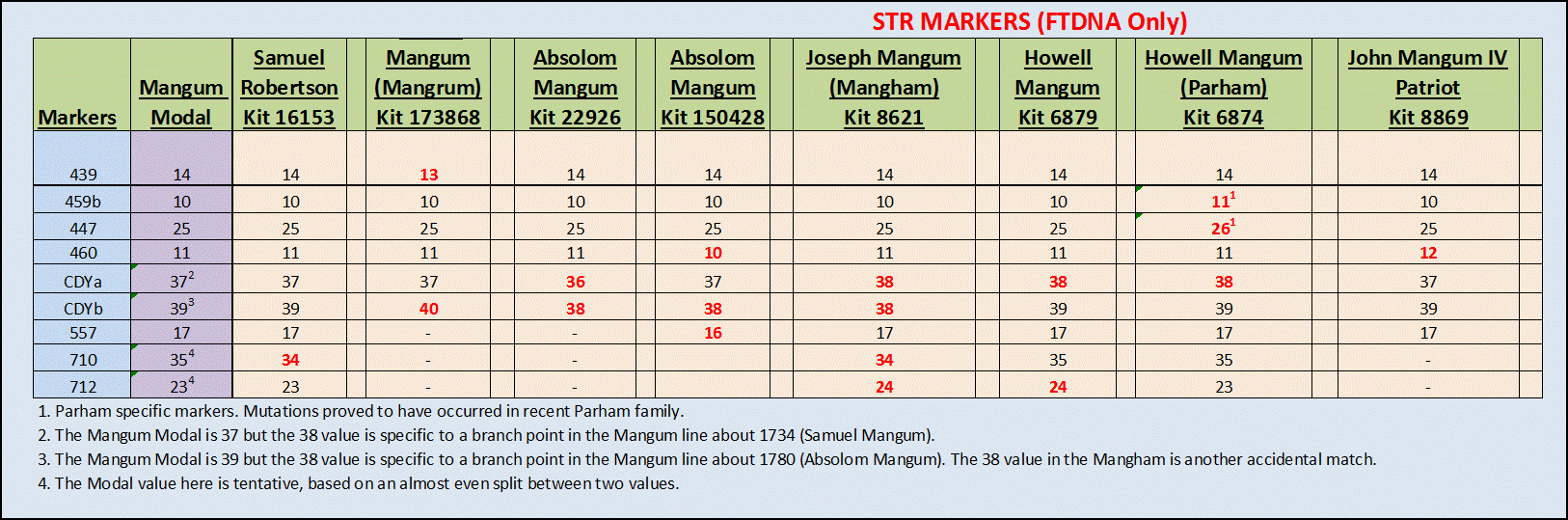 b. The Mangham’s markers (Kit 8621) (Joseph Mangum line?) have the most mutations away from the Mangum modal than any of the other Mangum lines, and usually has the most marker differences with the other participants. The reason is presently unknown.