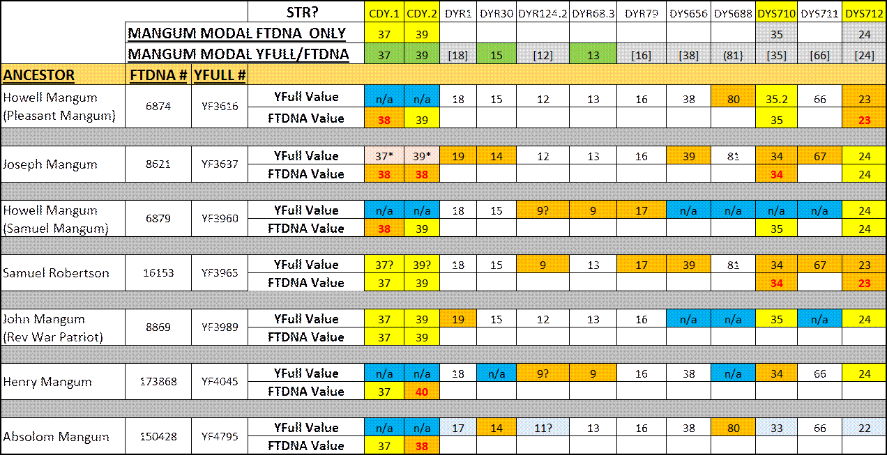[16] We determine the Mangum modal as the majority marker value out of a group of participant’s results, and consider that this is the value passed down to us from John Mangum, our immigrant ancestor. This works well when we have many participants with a large majority having the same marker value, and only one or a few having a different value. The latter are therefore considered mutations from the modal. In a few instances, determining the majority value is difficult when there are only a few values available, as in some of the YFull results, and especially when those few values are varied. In some cases in YFull, we only have a single value, giving us a tentative modal value, but at very low confidence.